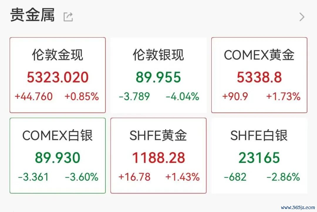 金银短线跳水,现货黄金跌至5323美元/盎司。现货白银一度跌5%,现跌4.04%,报89.9美元/盎司。