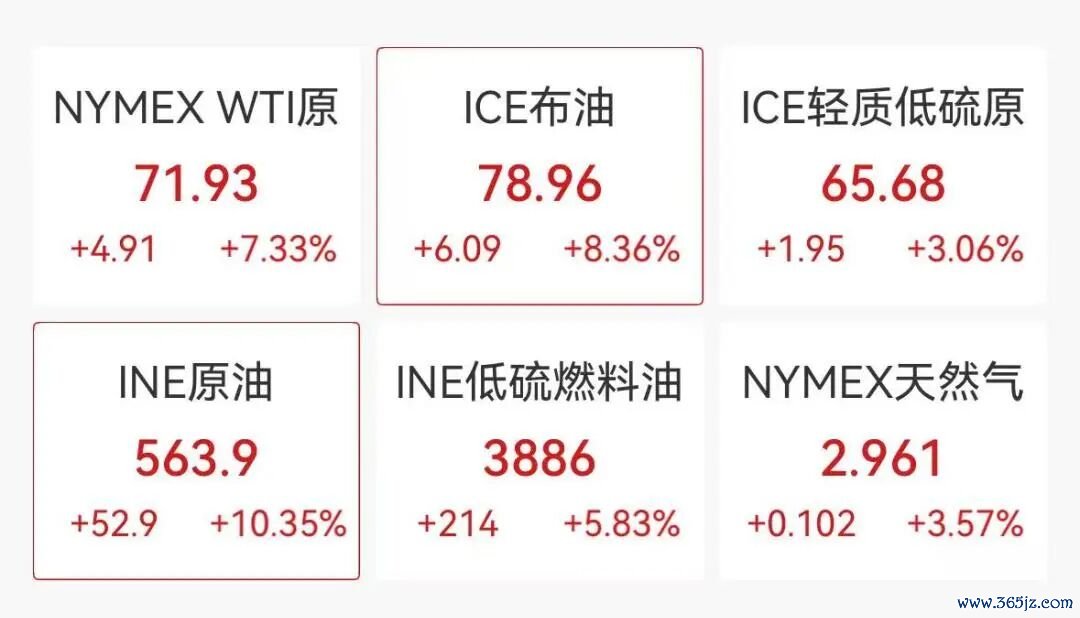 油价方面,布伦特原油大涨8%,至每桶78.96美元。WTI原油涨超7%,报71.93美元/桶。