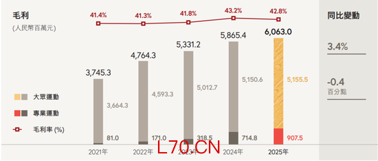 相比之下,大众运动分部的毛利仅增长0.1%,但毛利率下滑幅度轻微,从2024年的41.8%降至2025年的41.2%。