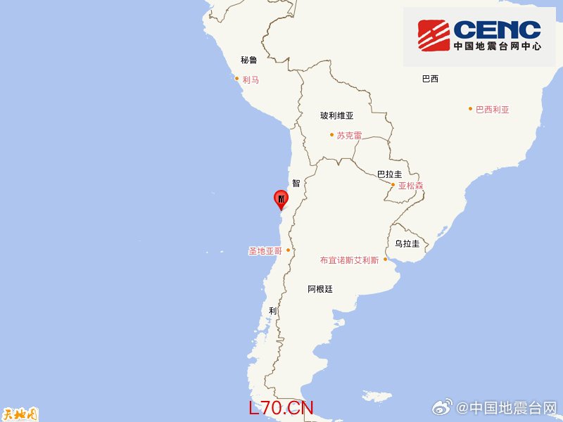 智利北部附近海域发生6.3级地震,震源深度20千米