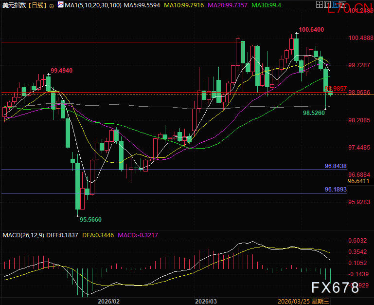 (美元指数日线图,来源汇通财经旗下易汇通)北京时间21:02,美元指数现报98.91。