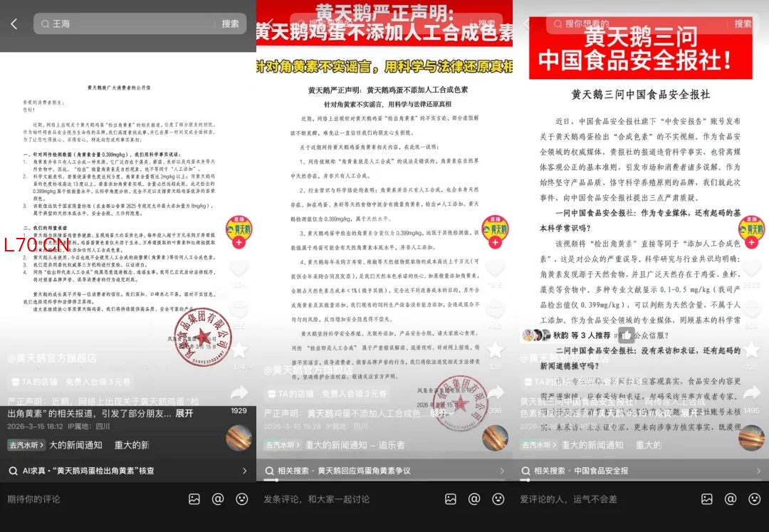 尽管在同一份报告中,黄天鹅检出的角黄素数值是最低的。但伴随多日发展,其目前已经成为这场角黄素风波的焦点与核心。连以来,销售方胖东来、品牌方黄天鹅、打假人王海、跟进该事件的媒体接连发声。截至发稿,黄天鹅已就风波发布多份声明,并表示将依法追究相关方法律责任。此外,其还向报道此事的中国食品安全报社发送了律师函。