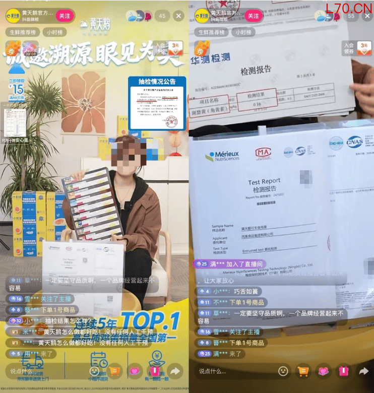 在黄天鹅直播间里,主播反复展示检测报告、律师函并解答弹幕质疑。有主播直言:今天的直播不以带货为目的,主要是和大家做一个说明。主播身后,抽检检查公告和“诚邀溯源眼见为实”的标语被设置为了直播背景。