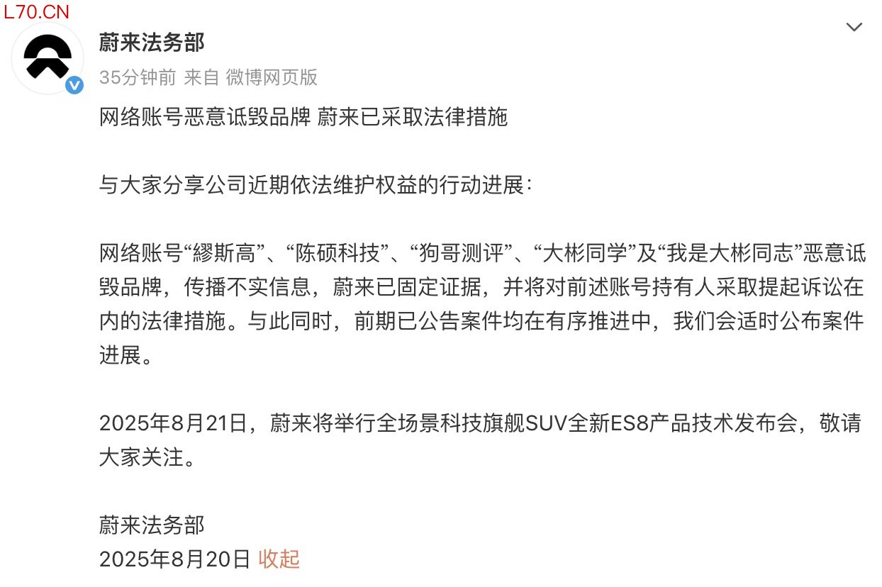 蔚来法务部:网络账号恶意诋毁品牌 已采取法律措施