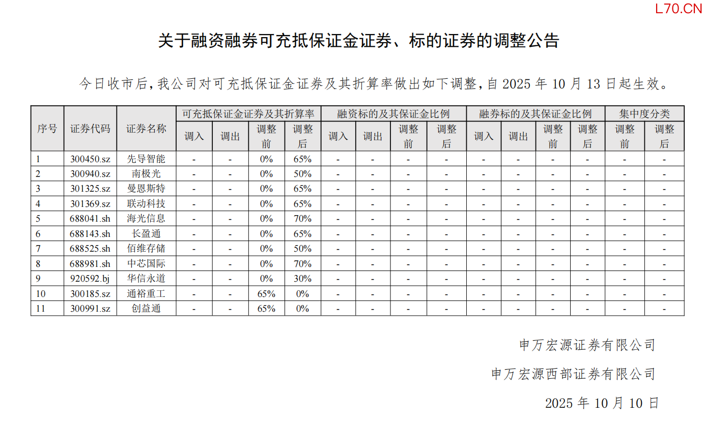 两券商将中芯国际等股票两融折算率从0%调回70%