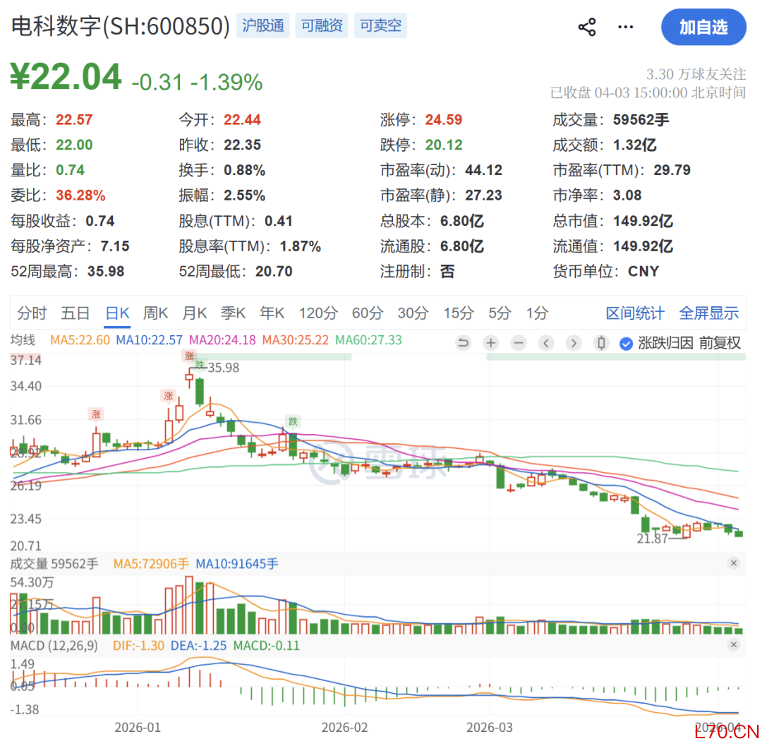根据行情数据,电科数字在今年1月12日股价达到35.98元的高点后,开始震荡走低。截至4月3日收盘,电科数字报22.04元/股,总市值为150亿元。