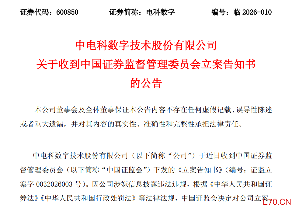 4月3日晚间,A股上市公司电科数字发布公告称,其于近日收到中国证监会下发的《立案告知书》。因电科数字涉嫌信息披露违法违规,证监会决定对该公司立案。