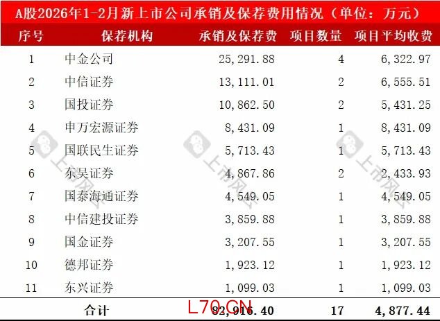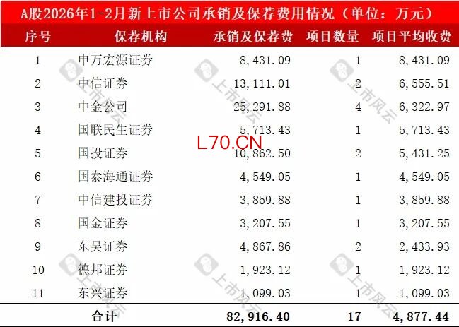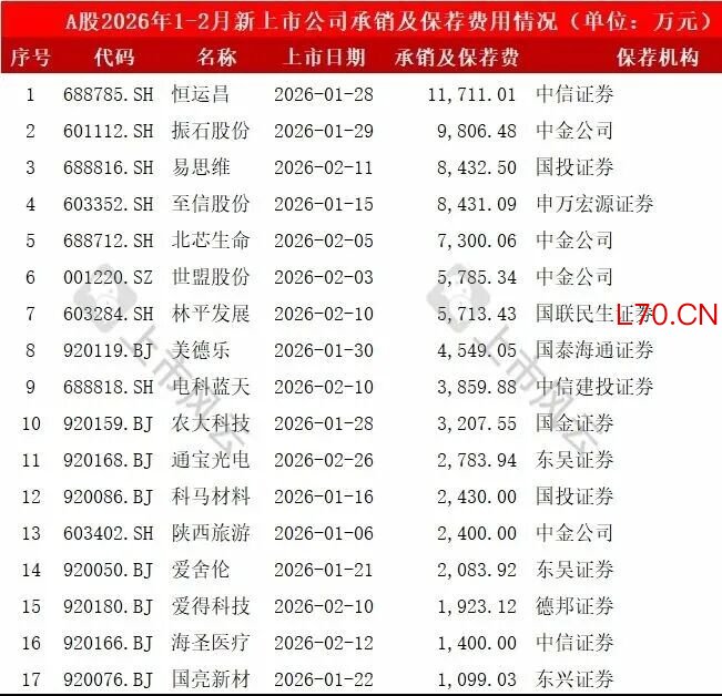 2026年1-2月,17家A股新上市公司的IPO保荐机构、承销及保荐费用详细如下: