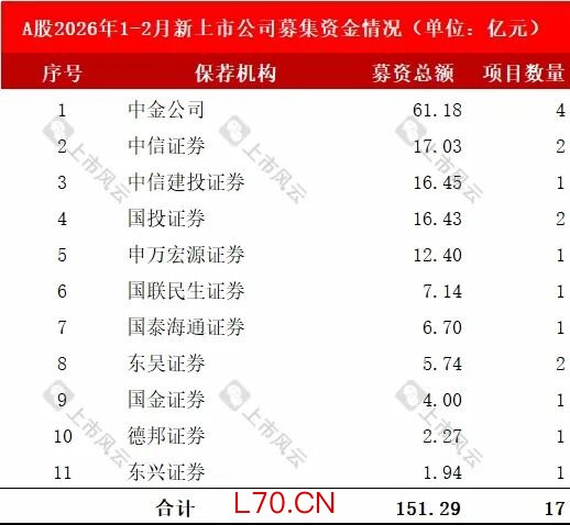 2026年1-2月共有11家保荐机构为17家新上市公司IPO提供上市保荐服务。