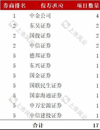 保荐机构按照项目数量排名前三的是:中金公司以4家项目排名第一;东吴证券、国投证券、中信证券以2家项目并列排名第二。