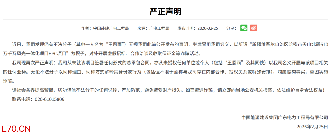 虚构项目诈骗更是触目惊心。2026年1月,新疆库车500MW/2000MWh储能项目曝出18.77亿元骗局,不法分子将空壳公司包装成“央企子公司”,以18.77亿元储能项目名义虚假招标,涉嫌诈骗。同月,新疆哈密又现610万千瓦风光一体化项目虚假招标案,不法分子冒用中国能建名义,收取施工保证金实施诈骗。