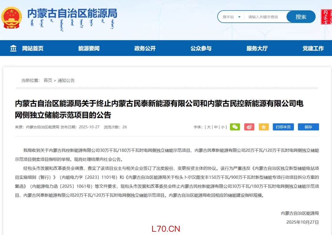 路条倒卖同样严峻,内蒙古民控、民泰新能源两个合计500MW/3GWh的储能项目,因涉嫌倒卖指标被终止,建设指标被官方收回,成为行业整治典型。此外,2025年也多次出现冒用国企身份乱象,中国电建被伪造材料注册子公司,中核集团被人员冒充高管开展非法活动等。